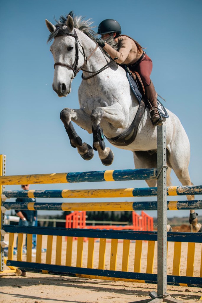 Next mount the horse correctly by hopping up with the foot on ground or mounting block and not by stepping too hard down on the stirrup iron .